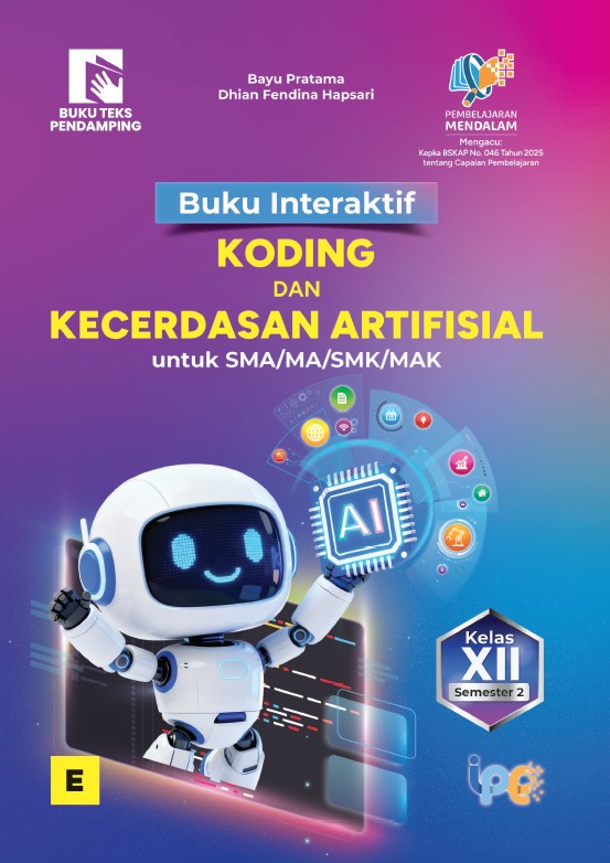 Buku Interaktif Koding dan Kecerdasan Artifisial untuk SMA/MA/SMK/MAK Kelas XII Semester 2 bertujuan memperluas, memperdalam, memperkaya, dan melengkapi materi esensial Koding dan Kecerdasan Artifisial (KA) Kelas XII. Buku ini berisi 3 bab yang disajikan sesuai dengan Kurikulum dan Panduan Mata Pelajaran Koding dan Kecerdasan Artifisial. Urutan bab yang disajikan ialah Bab 1 Pemanfaatan Basis Data untuk Pemecahan Masalah, Bab 2 Dampak dan Isu dalam Pemanfaatan Kecerdasan Artifisial, dan Bab 3 Membangun Solusi Digital dengan Kecerdasan Artifisial.