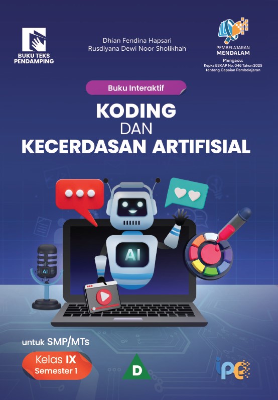 Buku Interaktif Koding dan Kecerdasan Artifisial untuk SMP/MTs Kelas IX Semester 1 bertujuan memperluas, memperdalam, memperkaya, dan melengkapi materi esensial Koding dan Kecerdasan Artifisial (KA) Kelas IX. Buku ini berisi 2 bab yang disajikan sesuai dengan Kurikulum dan Panduan Mata Pelajaran Koding dan Kecerdasan Artifisial. Urutan bab yang disajikan ialah Bab 1 Berpikir Komputasional: Mengembangkan Solusi Efektif dengan Teknologi dan Bab 2 Menjadi Kreator Konten